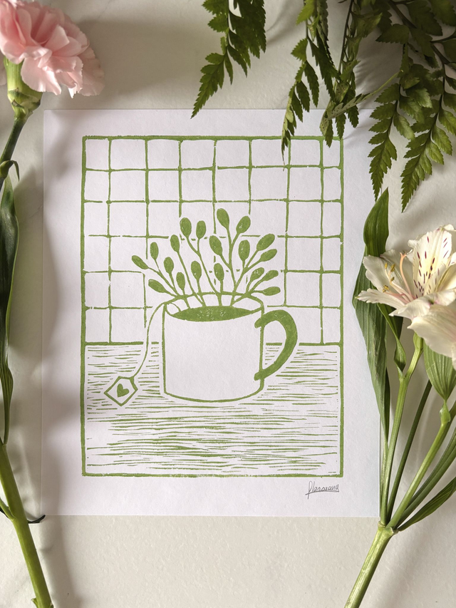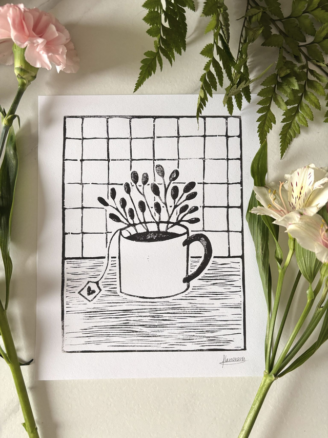 This A4 (21x25cm) linocut print blends familiar elements with a poetic twist: a comforting cup of tea, in which a plant is growing, surrounded by a checkered background that evokes a vintage kitchen feel.