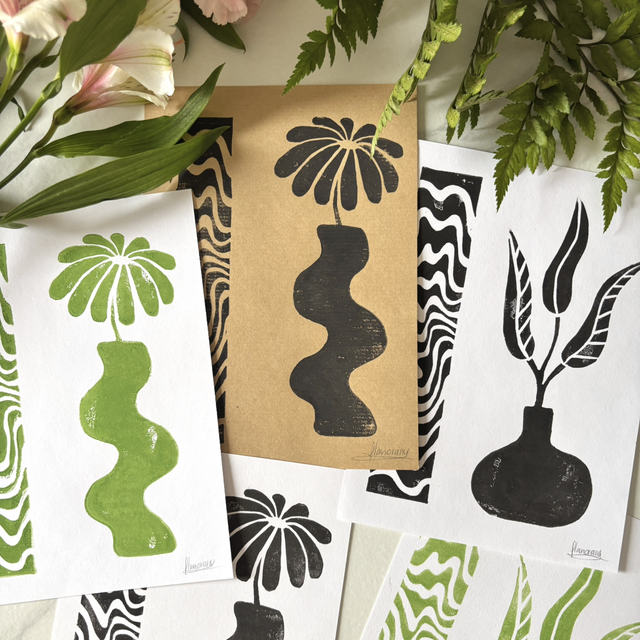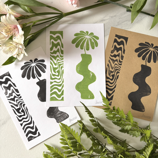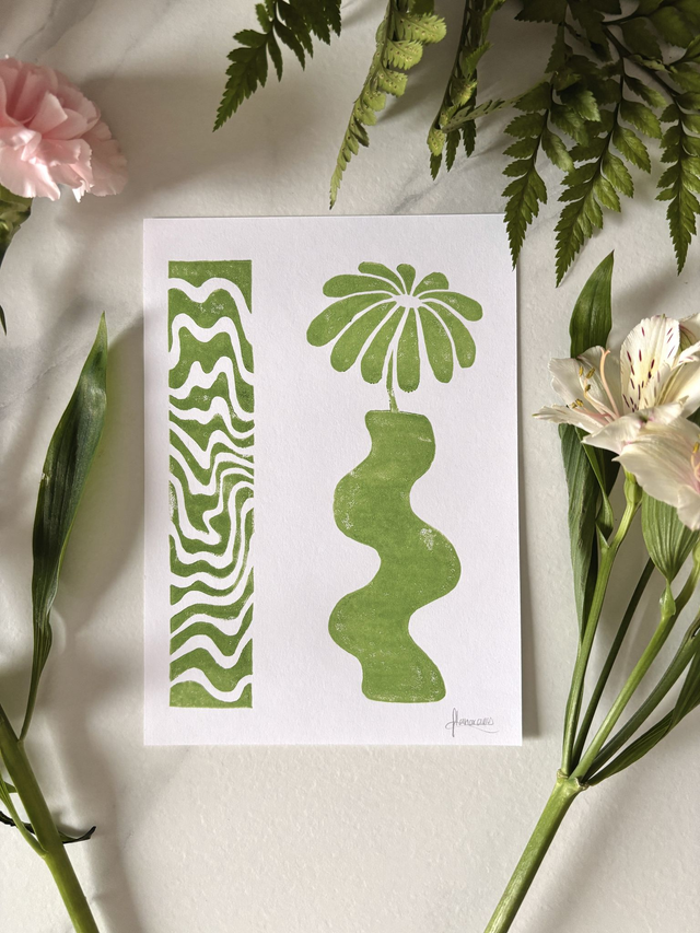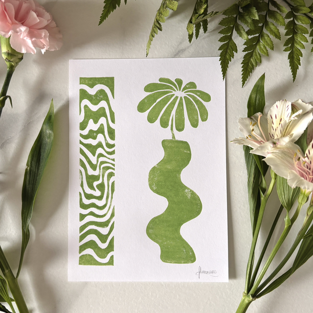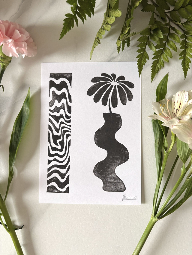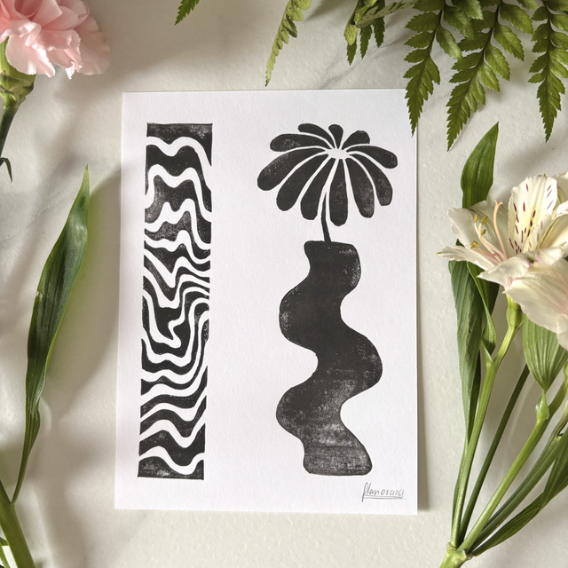 This A5 linocut print features a delicate flower in a pot, paired with an abstract pattern that symbolizes the hazy memory of a moment, lost between reality and dream. Each print is individually hand printed, giving it a unique texture and artisanal look.