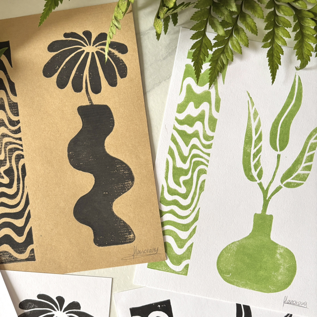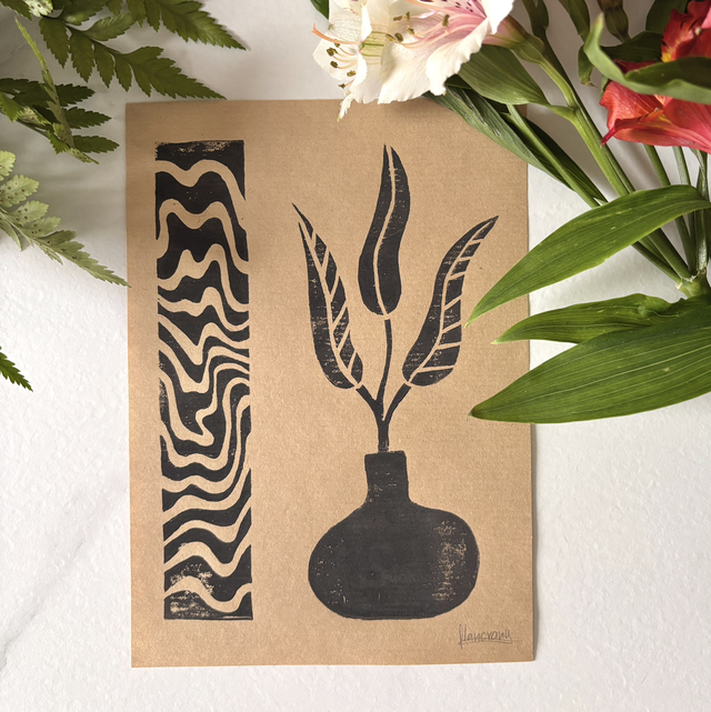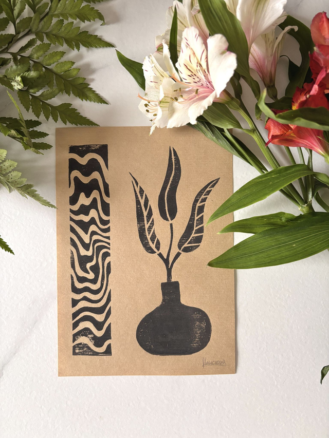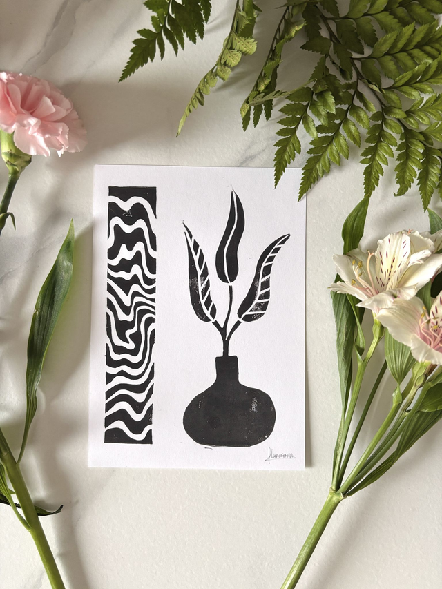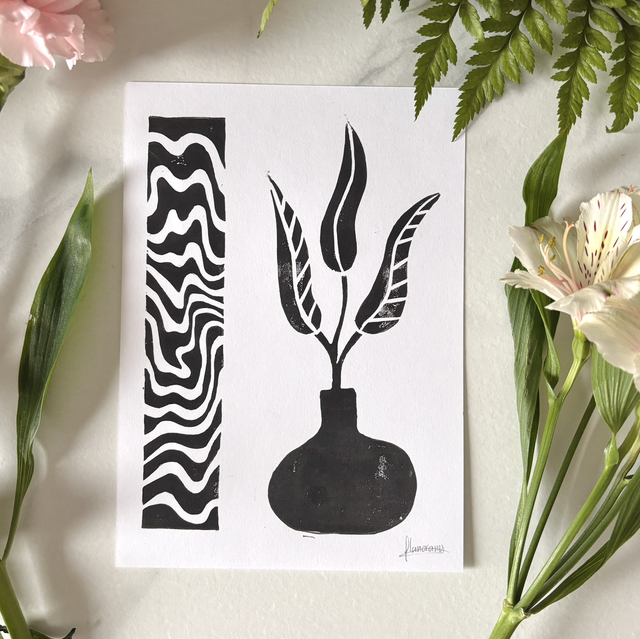 This A5 linocut print features a delicate plant in a pot, paired with an abstract pattern that symbolizes the hazy memory of a moment, lost between reality and dream. Each print is individually hand printed, giving it a unique texture and artisanal look.