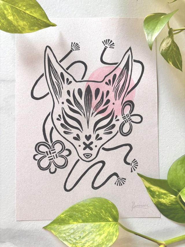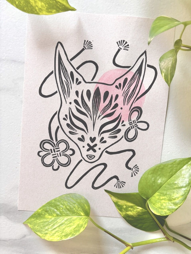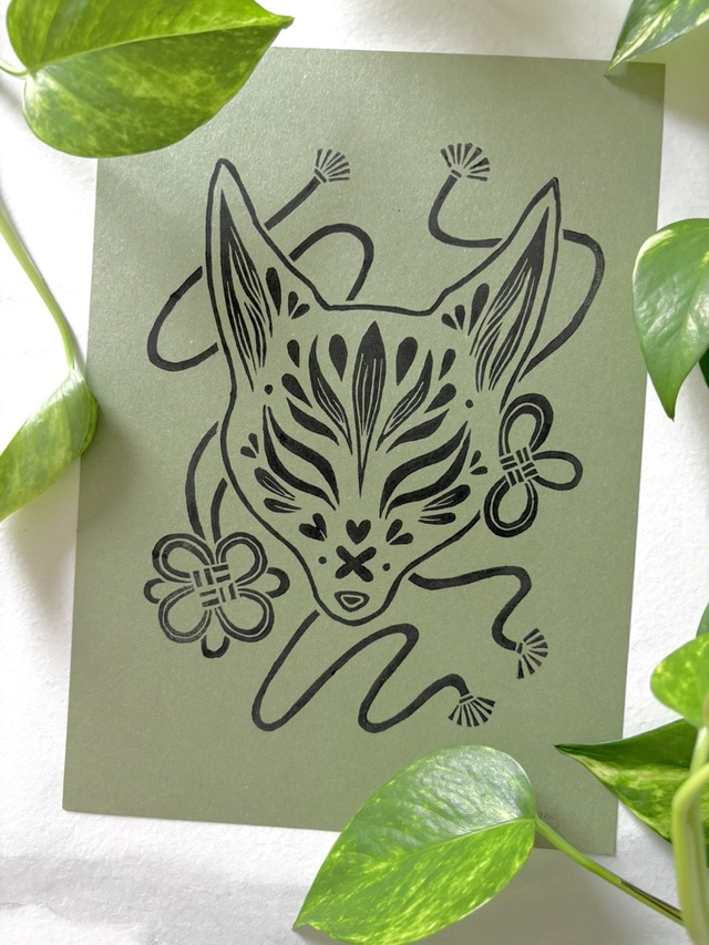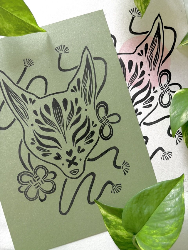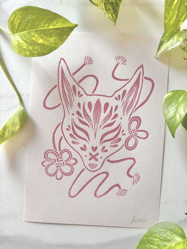 This A4 linocut print features a kitsune mask, a powerful symbol of Japanese folklore and transformation. The stylized design gives a modern yet mystical feel, balanced by subtle ink choices and soft textures.
